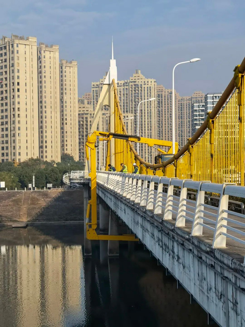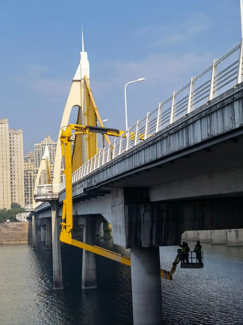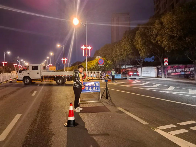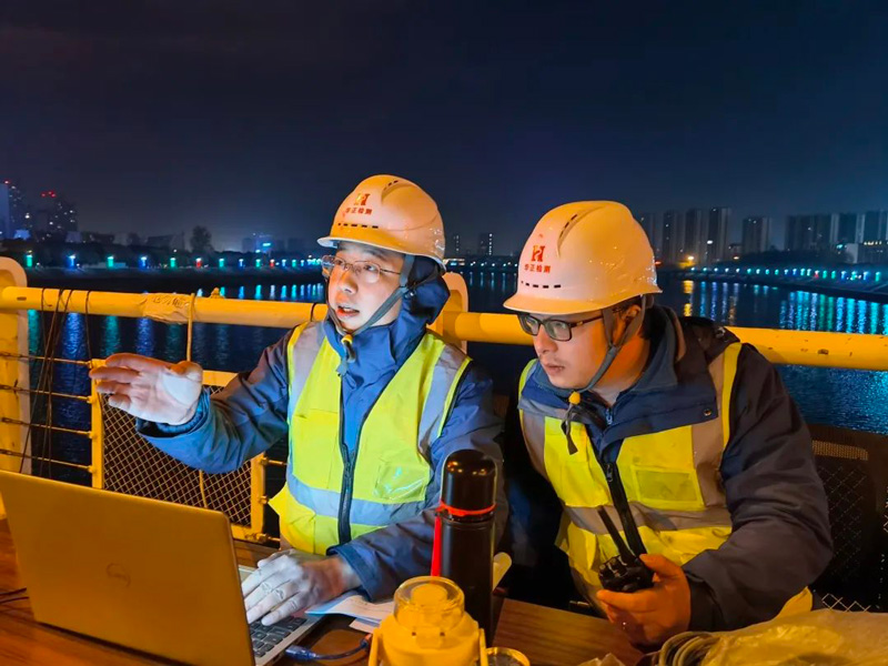 康濟橋、永濟橋橋梁檢測分為外觀檢測和實體檢測兩個部分。外觀檢測中工作人員以橋梁檢測車作為作業(yè)平臺,通過近距離對橋梁構(gòu)件進行觀測、檢查、記錄,為橋梁健康“望聞問切、把脈問診”。實體檢測中難度最大的是橋梁荷載試驗。為保證荷載試驗的安全性和檢測數(shù)據(jù)的準(zhǔn)確性,華正檢測提前與交警部門通過媒體聯(lián)合發(fā)布了橋梁檢測期間臨時交通管制通告,將荷載試驗安排在通行流量較少的凌晨。試驗過程中對大橋?qū)嵤╅g斷封閉,采用了11輛荷重為40噸的三軸貨車,在橋面指定位置停放來模擬橋梁的設(shè)計荷載,通過靜態(tài)采集系統(tǒng)及全站儀檢測橋梁的應(yīng)力應(yīng)變及位移變形情況,同時與檢測方案中的理論數(shù)據(jù)相印證,判斷橋梁的實際承載能力與剛度;另外又通過動態(tài)采集系統(tǒng),采用跑車和跳車等動載試驗得到橋梁的自振頻率、沖擊系數(shù)及阻尼比等參數(shù),判斷橋梁的動力響應(yīng)情況。通過以上全方位的靜載和動載試驗,綜合評價橋梁的實際工作性能。