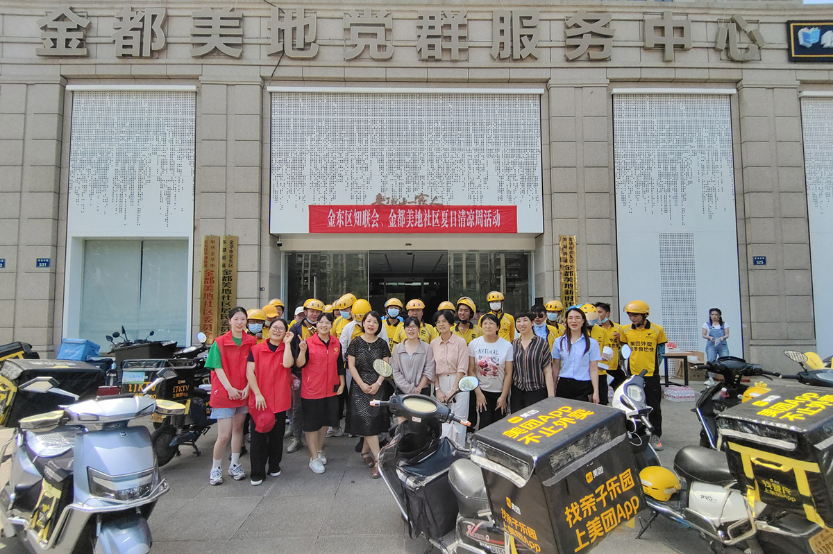 ? ? ? 隨后,慰問組前往多湖街道金都美地社區(qū)黨群服務(wù)中心,為“金東區(qū)知聯(lián)會暖心服務(wù)站”揭牌,并為外賣員、快遞員及環(huán)衛(wèi)工人送去冰鎮(zhèn)綠豆湯、西瓜、藿香正氣丸、小風(fēng)扇等。來自江西的小肖說,自己剛滿18歲,從事外賣員工作不足一月,“比想象中辛苦,風(fēng)吹日曬的,發(fā)的這些東西很實用,能降溫解暑。”