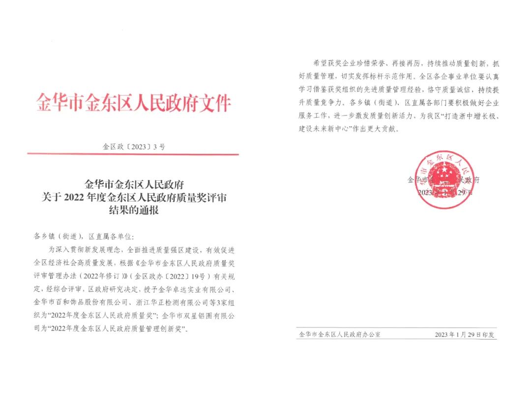 ? ? ? 1月29日,浙江華正檢測(cè)有限公司被金東區(qū)人民政府授予“2022年度金東區(qū)人民政府質(zhì)量獎(jiǎng)”。2月28日上午,受區(qū)政府委托,金東區(qū)市場(chǎng)監(jiān)管局副局長(zhǎng)應(yīng)建設(shè)、質(zhì)量與標(biāo)準(zhǔn)計(jì)量科科長(zhǎng)曹金福等蒞臨華正檢測(cè)走訪并頒獎(jiǎng)授牌。?獲此殊榮充分彰顯了華正檢測(cè)以高質(zhì)量技術(shù)服務(wù)鍛造的“硬實(shí)力”,也表明華正檢測(cè)多年來(lái)“經(jīng)營(yíng)質(zhì)量提升”工作取得的顯著成果。