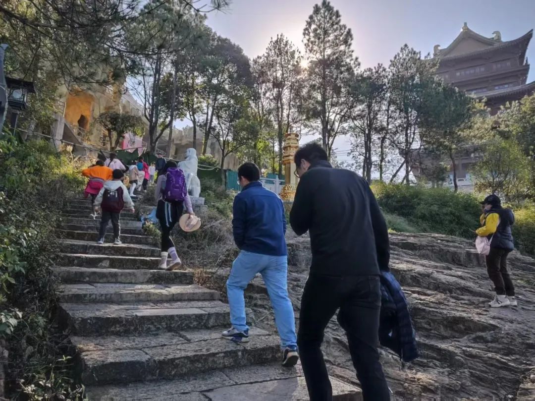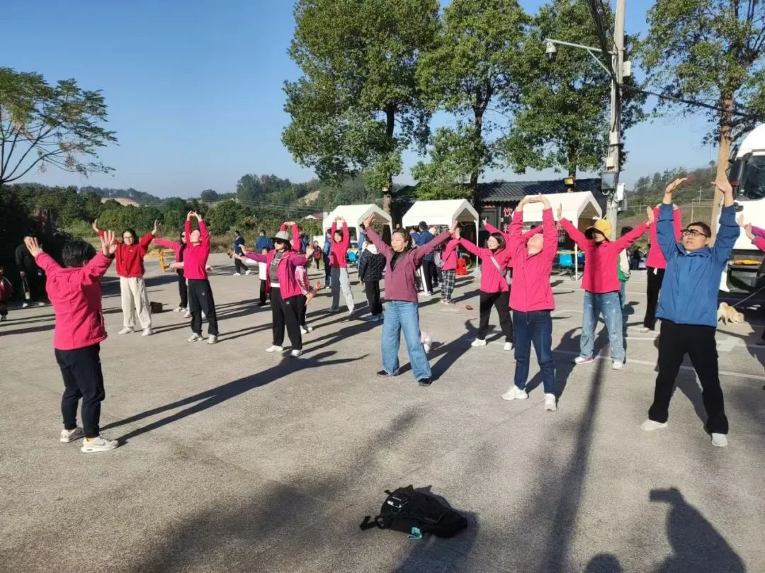 員工們先來(lái)一段八段錦健身操熱熱身,為登山做好準(zhǔn)備。